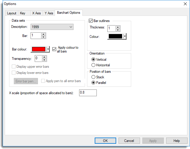 This lets you set the colour and transparency of the bars and control the display of the error bars, if present. 0 is opaque and 255 is completely transparent.