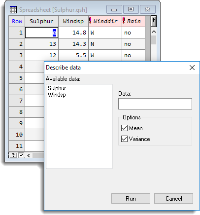 To associate the check boxes with the SELECTION option of the DESCRIBE procedure, both the CHECKBOX statements are given the matching id SELECTION. Similarly, to associate the edit control with the DATA parameter the EDITTEXT statement is given the matching id called DATA. The dialog is given a run button using the BS_RUN flag. When the Run button is clicked it will form a Genstat command using the DESCRIBE procedure and submit the command to the server. The ‘&’ character is used in text for the controls to specify mnemonic characters for the dialog. To use the dialog in Genstat you must save the code to a file (preferably in an add-in folder) with the extension .grc, for example, describe.grc.