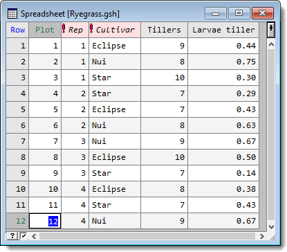 In the following spreadsheet image a number of ryegrass tillers was sampled in each plot and the number of weevil larvae in these tillers was counted. The column Larvae tiller contains the mean number of larvae per tiller.