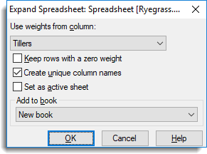 | Use weights from column | Specifies which spreadsheet column contains the weights to be used in the expansion. Each row is repeated the number of times specified by the values in this column. If the column is a factor, then the levels values of the factor will be used, and if these are not defined, then the ordinal values will be used. |
