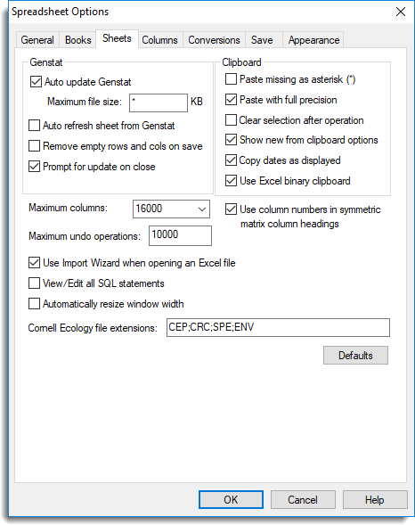For very large spreadsheets updating the data to Genstat can be time consuming. The Maximum file size option lets you specify a limit for the size of spreadsheets that allow automatic updating of data to Genstat. Therefore, any spreadsheets larger than that value given will have the automatic updating disabled, and the spreadsheet must then be updated using one of the Spread | Update menu items.