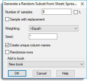 If a column in the dropdown list is selected, then the values in the selected column will be used in a weighted random sample. The default is the setting, where all rows have equal chance of being selected. Rows with a weight value ≤ 0 will not be included in the random sample.