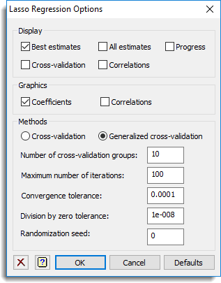 | Generalized cross-validation | Use the generalized cross-validation, as specified by Tibshirani (1996) – see RLASSO for full reference |