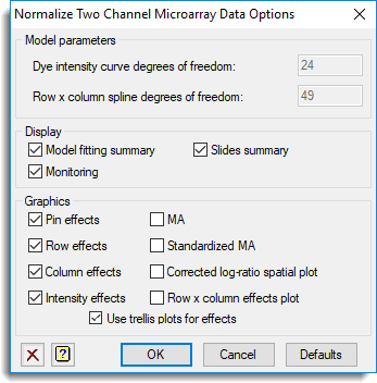 The number of degrees of freedom in the curve (spline or loess) relating spot brightness on the log 2 scale (intensity) and the log-ratios. Increasing this value will make the curve more flexible, but will increase the time to fit the model, and may over fit the relationship. This value must be greater than 3.