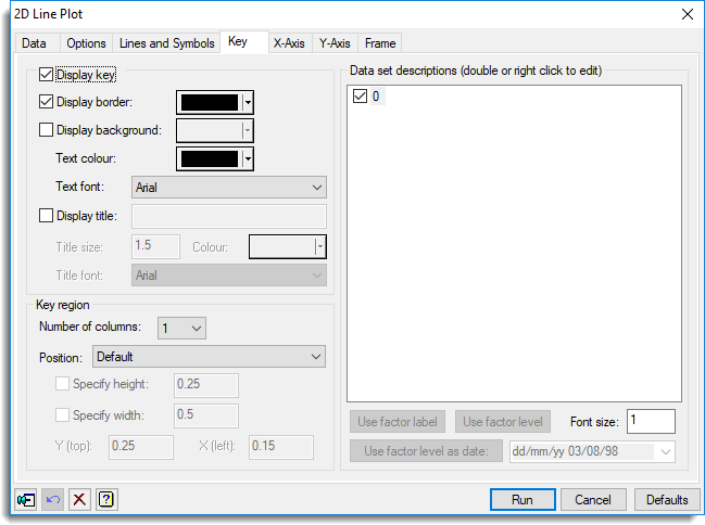 Use this to control the display and contents of the key or legend provided for the current graph. The position and attributes of the key are set up in the Display key and Key region sections. The descriptions or text for key items are set up in the Data sets descriptions section. This tab cannot be used until you have selected the data to be plotted. If the data to be plotted is changed the descriptions will be reset to the default text. This tab is only available on the 2D Scatter plot, 2D Line plot, 3D Scatter plot and Polar plot graphics menus.